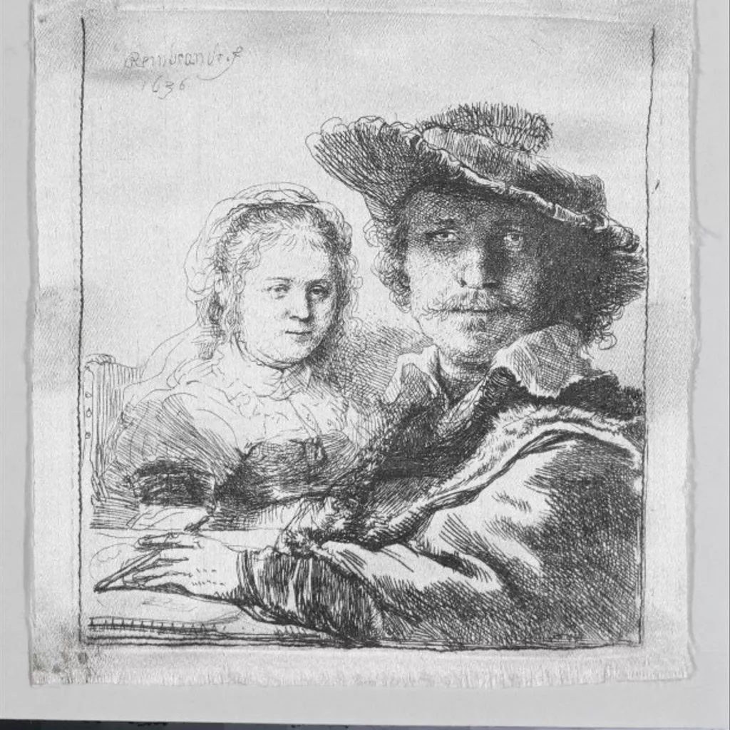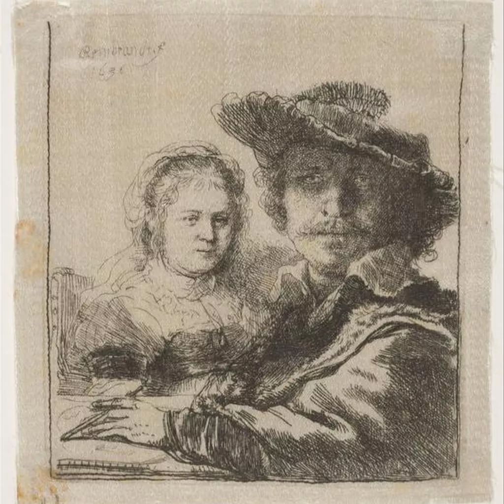 Etching by Rembrandt van Rijn, 'Self portrait with his wife Saskia', 1636, second state, printing on silk from original copper plate in the 18th century