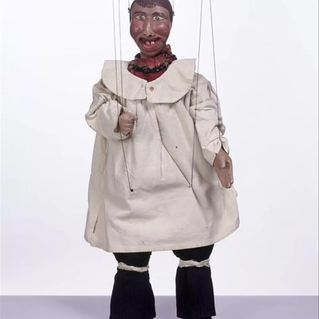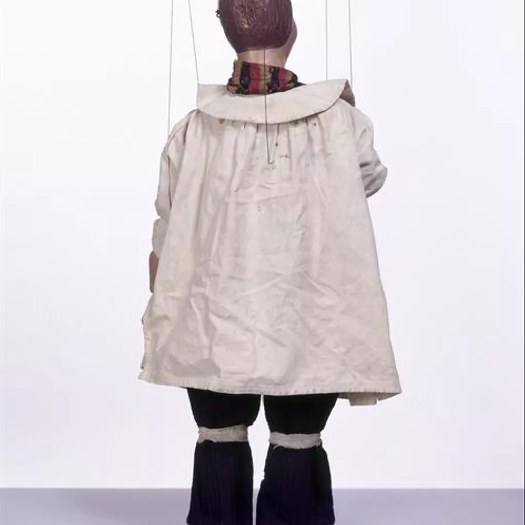 This is one of 35 marionettes from the Tiller-Clowes troupe, one of the last Victorian marionette troupes in England. Marionette shows were a popular form of entertainment for adults in the 19th century, many of them family concerns which travelled around the country long before the advent of film and television, presenting shortened versions of London's latest popular entertainment from melodramas and pantomimes to minstrel shows and music hall. In the 18th and early 19th centuries their theatres were relatively makeshift, but after about 1860 many became quite elaborate, with walls constructed from wooden shutters, seating made from tiered planks of wood, and canvas roofs.