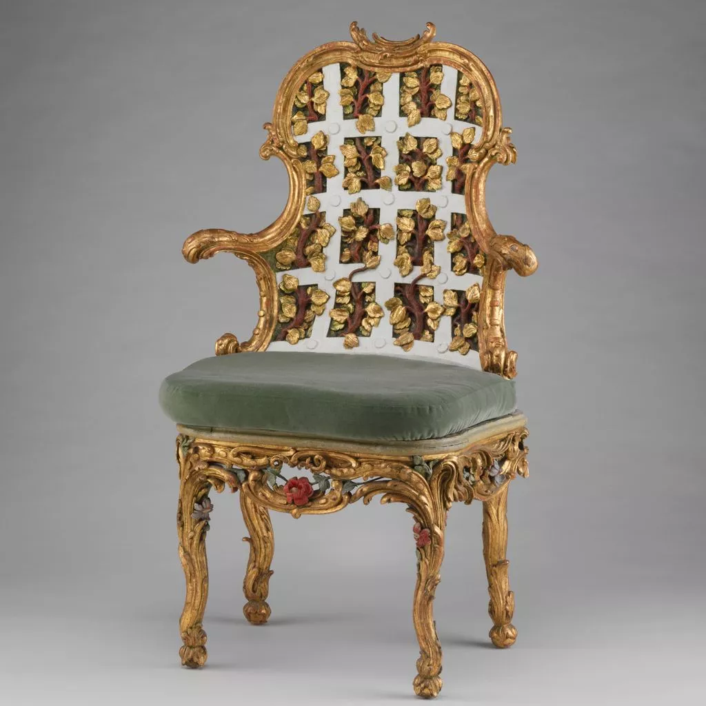 The settees and chairs illustrated here (see 1974.356.114–.121) were made for the Franckenstein Pavilion in the gardens of Seehof Castle near Bamberg, one of the three summer residences in Southern Germany used by Adam Friedrich von Seinsheim, prince bishop of Würzberg and Bamberg. A true garden enthusiast, it was under von Seinsheim that the gardens of Seehof were embellished, which must have resembled the still extant Rococo gardens completed by von Seinsheim at Veitshöchheim. His love for gardens and garden imagery also carried over into the interior decoration and furnishings of his castles, as the Seehof furniture demonstrates. A unique example of German Rococo furniture executed in a more flamboyant style than its French prototypes, the ensemble was designed specifically for the Garden Room in the Franckenstein Pavilion. Used as an audience room, it was referred to as the "Green Trellis Chamber" in the 1774 Seehof inventory and painted entirely with trompe l'oeil trellis and foliage. The garden room's furniture was made to match: the backs of the chairs and settees are richly carved in the form of garden trellis-work with colored flowers and foliage.