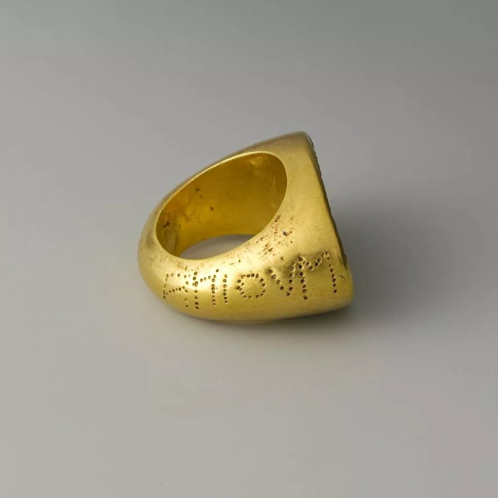 This large gold ring is one of 43 objects in the museum's collection from a single tomb discovered near Bolsena, north of Rome. While the ring no longer has the gem that once filled its sizeable ovoid bezel, it is inscribed on either side with the Etruscan word SUTHINA, indicating that this object was dedicated as a tomb offering. The words were not etched into the ring but rather were formed by a series of small, discrete punched dots. This item of jewelry, along with a number of the other objects in the tomb, probably belonged to the deceased in life and was then marked accordingly upon his or her death.