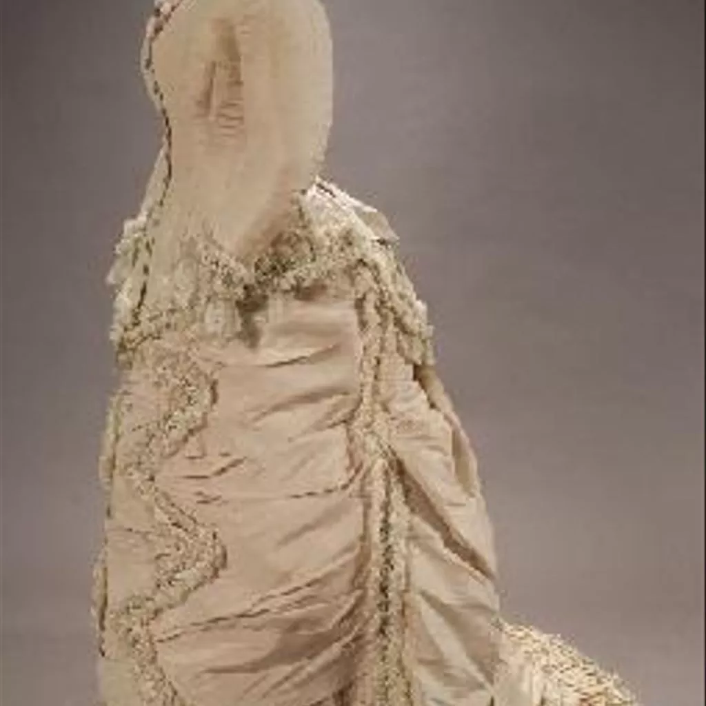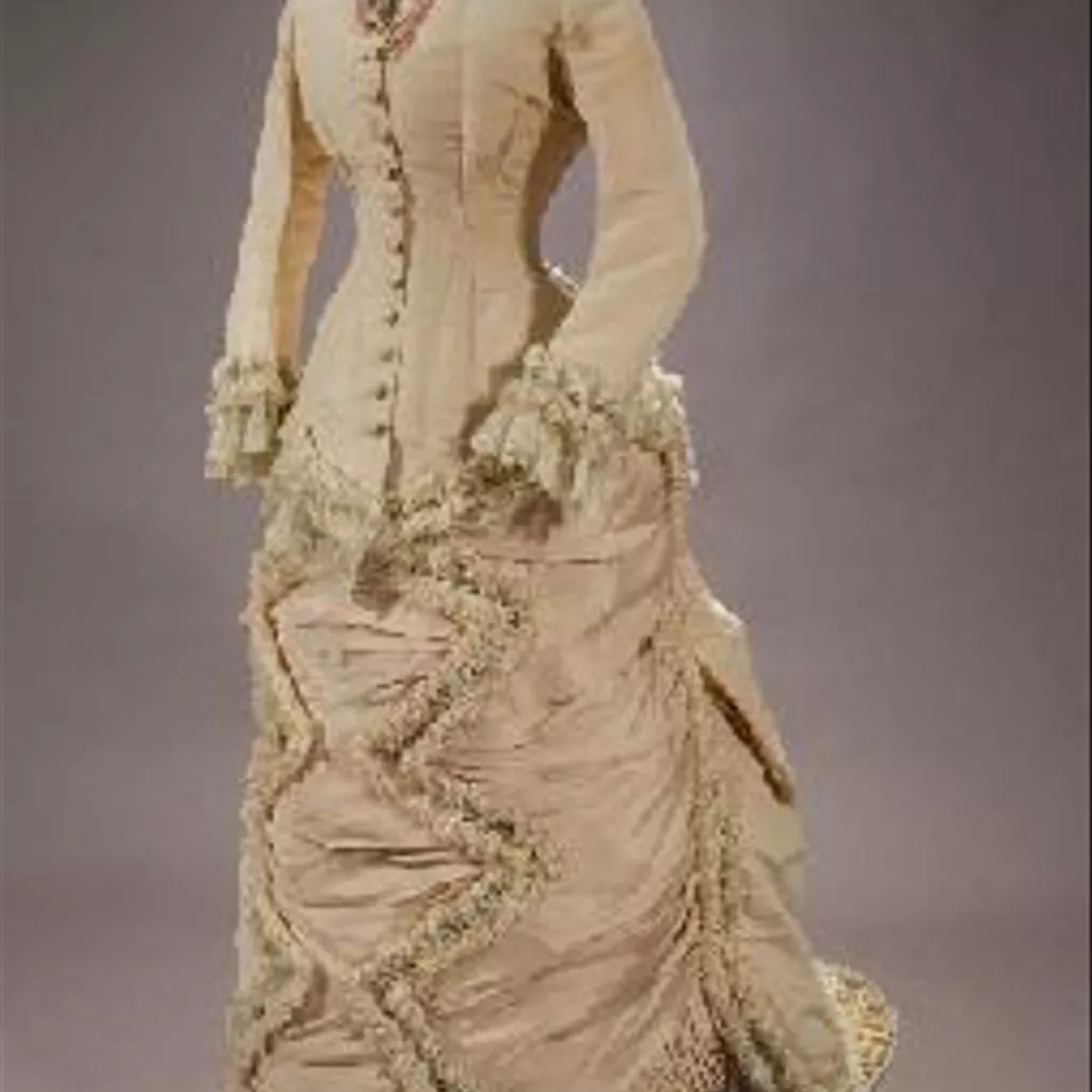 Romanticismo Traje dos piezas confeccionado en gros de tours rosa. Chaqueta a la cadera muy entallada, mangas largas rematadas en la bocamanga con cinta jacquard de diseño floral con flecos y puntilla blanca de encaje de imitación de bolillos. Escote cerrado por detrás y en pico por delante, rodeado del mismo encaje, más estrecho, y flecos rosas (posteriores). El delantero, abierto totalmente en el centro, se cierra con doce botones forrados y ojales y se ajusta al cuerpo con pinzas del bajo al pecho en cada hoja. La espalda lleva costura central y dos en cada costadillo. La terminación inferior es de forma redondeada con el centro más pronunciado por delante, y por detrás se alarga hasta originar dos haldetas con adorno de lazada. Alrededor del contorno lleva los mismos adornos de cinta y encaje. Interior forrado en tafetán de seda beige, armado con ballenas y cinta de acanalado beige en la cintura con etiqueta: ´Maria Roux / Calle O`Donnell, 40 / Sevilla´. La falda lleva el delantero drapeado y adornos de cinta jacquard en zigzag. Por detrás el vuelo va distribuido con tablas y frunces y termina en una cola formada por tres volantes estrechos y plisados. El polisón unido a la cinturilla con tres botones va todo drapeado, terminando igualmente en cola, y rodeado por la misma cinta. Forro de nansú con puntilla blanca de Valenciennes mecánico.
