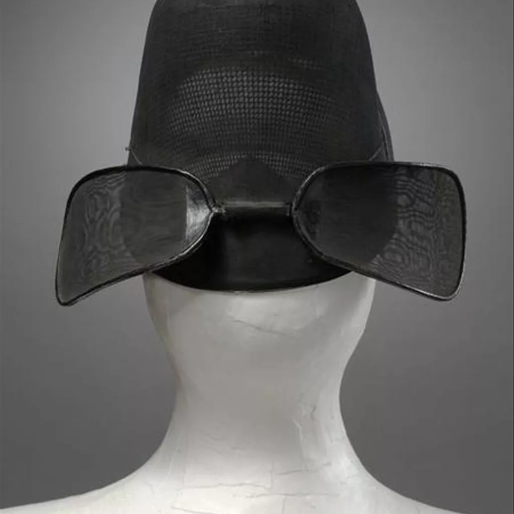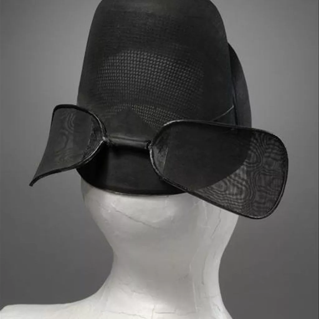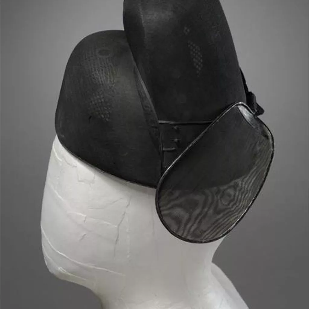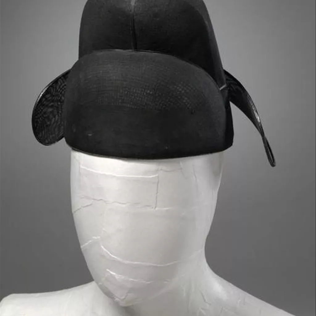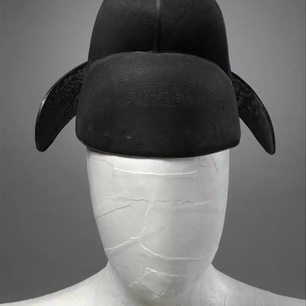 Hat of stiffened silk gauze in black. The hat consists of a skull cap and a rounded vertical part at the back. The frames are made of lacquered bamboo splints, stiffened hanji paper and horsehair, which are then covered with silk gauze. Attached to the back are a pair of fan-shaped pennons, made of bamboo frames covered with silk gauze. The edging is made of laquered paper-string. Hat of stiffened silk gauze in black, with two pennons at the back