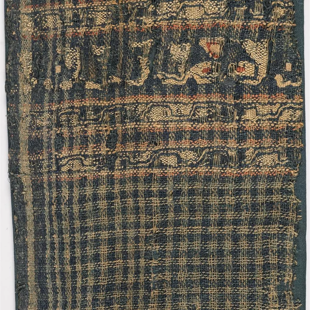 Sobre el fons de quadres del teixit s'insereix una banda decorativa, organitzada en diverses sanefes amb elements vegetals estilitzats, entre les quals hi figura un fris amb una inscripció.Les poques lletres conservades són en escriptura nash (cursiva) però tan deformada que fan impossible la lectura. El fragment és interessant sobretot pel seu disseny, i per tractar-se d'una tela d'ús corrent i no pas de luxe. Procedeix d'un taller fatimita.