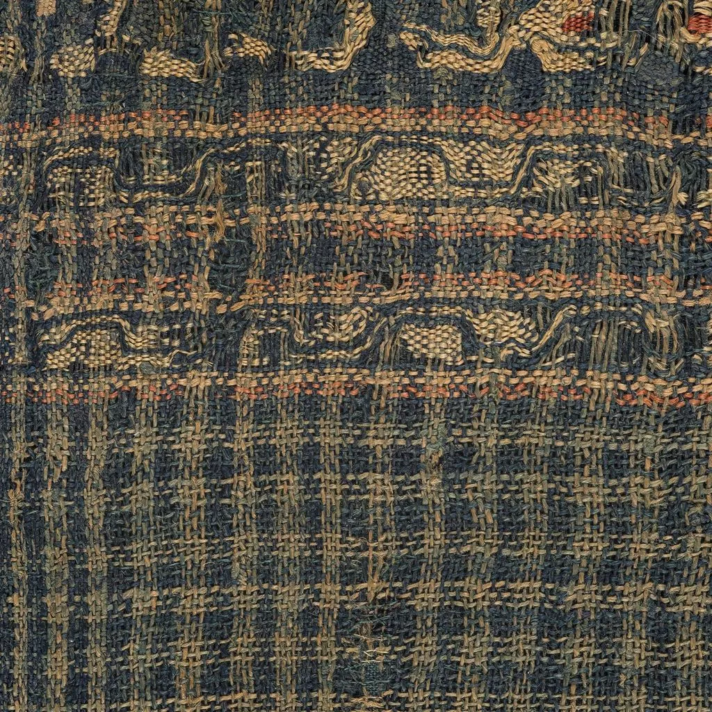 Matèria: lli de color blau i ocre, fils simples amb torsió en S.