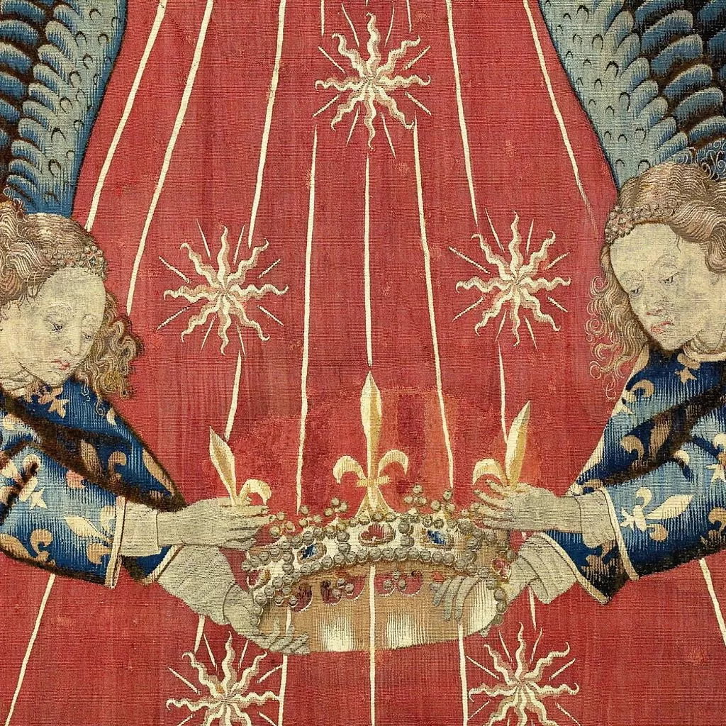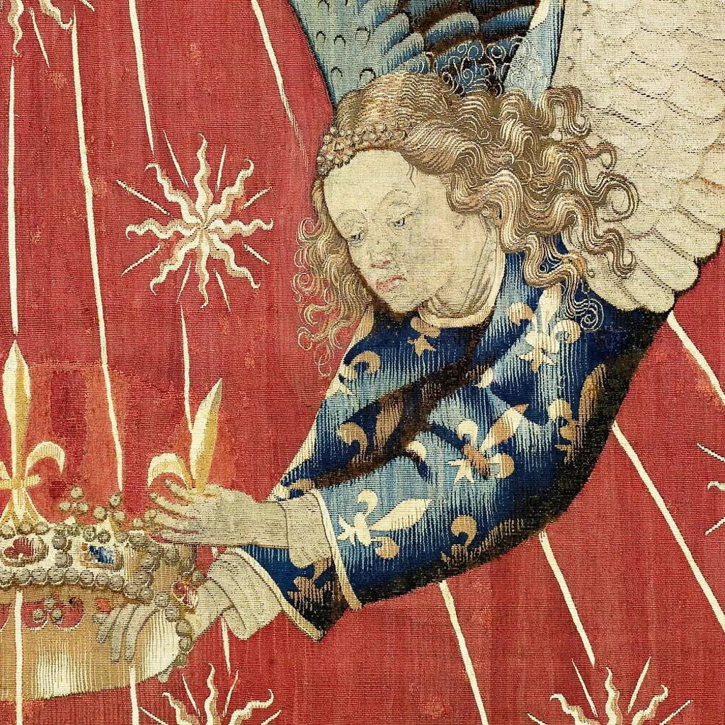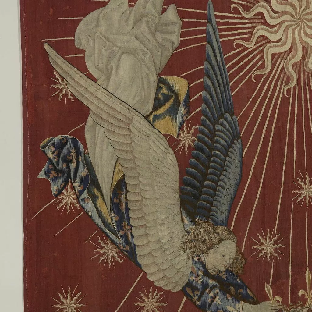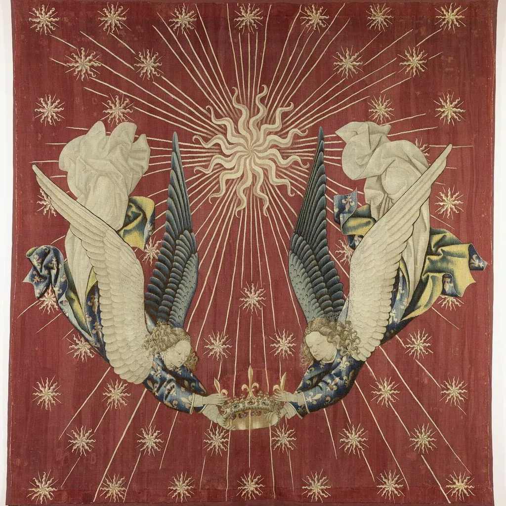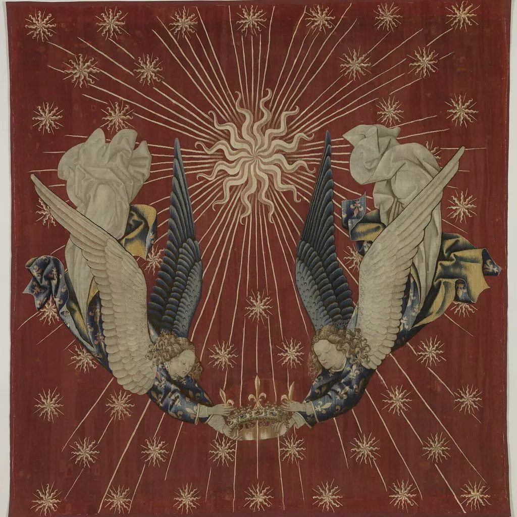 La composition du dais est extrêmement sobre : sur un fond rouge vermeil se détache un grand soleil à douze branches, dont les faisceaux de rayons sont chargés d’une multitude d’astres, tandis que deux anges en vol, vêtus de tuniques fleurdelisées, tiennent une couronne. L’analyse de l’emblématique a permis d’assurer la provenance royale de cette oeuvre : le soleil d’or sur fond vermeil fit en effet partie des devises adoptées par les rois de France au XVe siècle. Si Charles VI – roi de France de 1380 à 1422 – fut le premier à l’utiliser, le style de la tapisserie, en particulier les plis cassés des aubes des anges, ne correspond pas à l’époque de son règne. Ce dais ou plus précisément ce dosseret, c’est-à-dire la partie verticale du dais, surmontait un trône de Charles VII (texte Elisabeth Antoine).