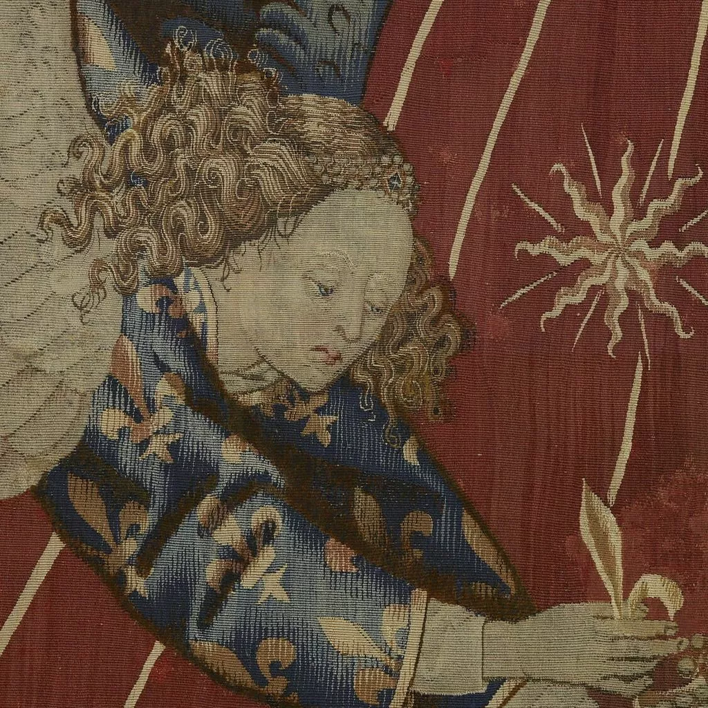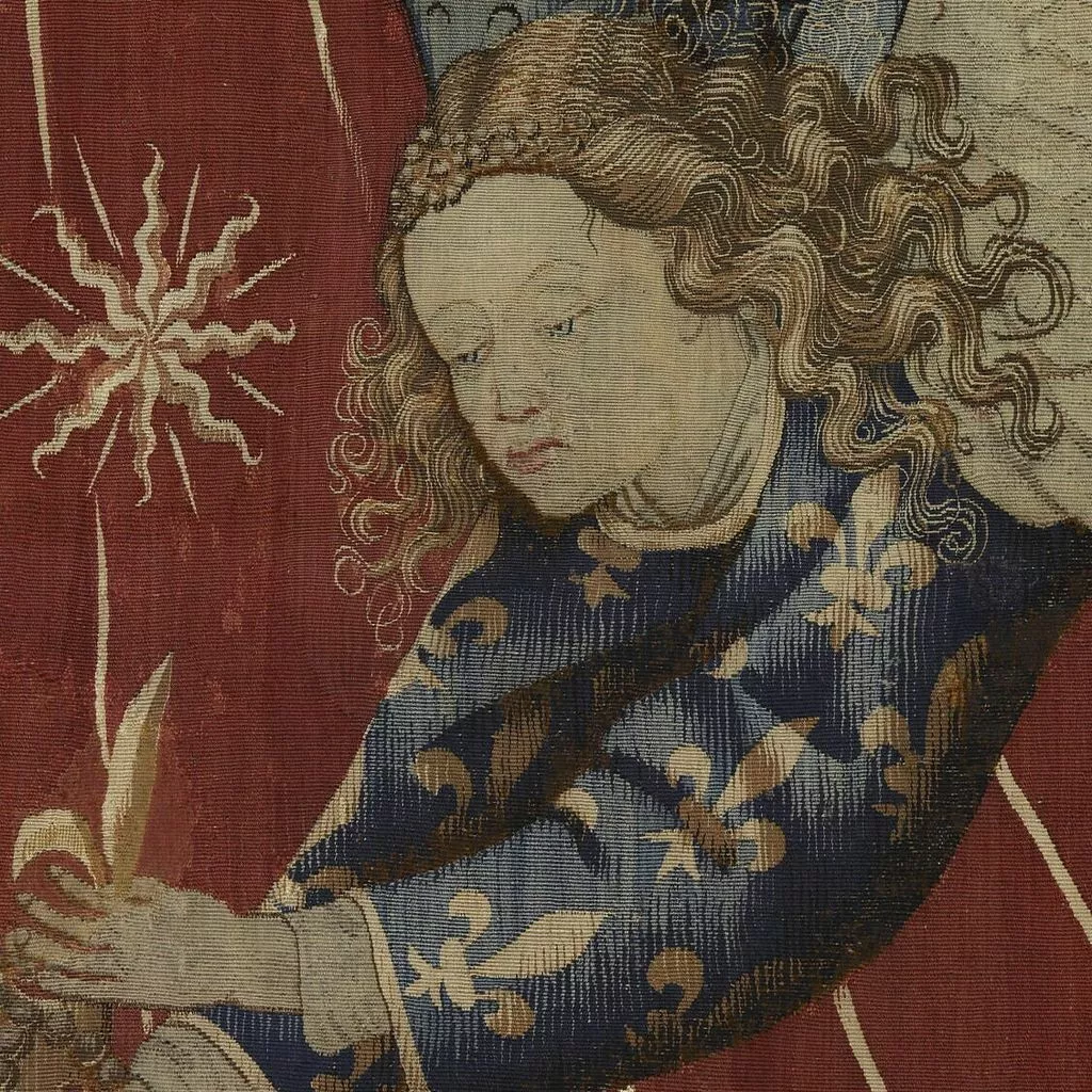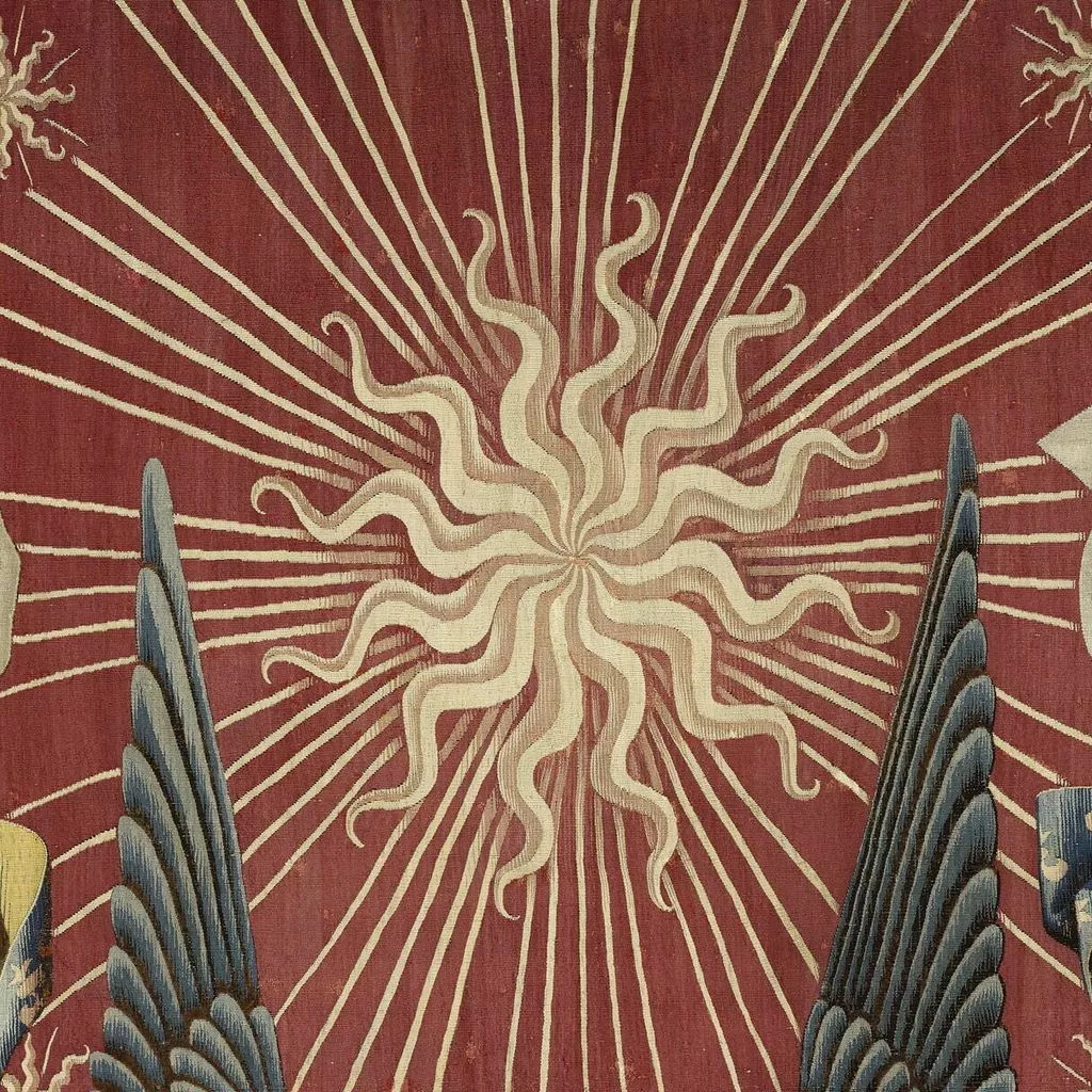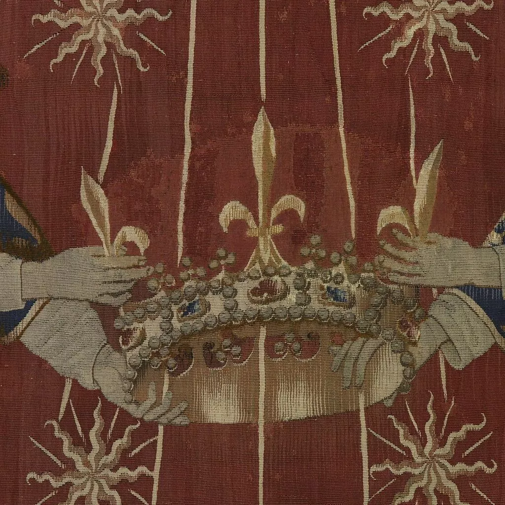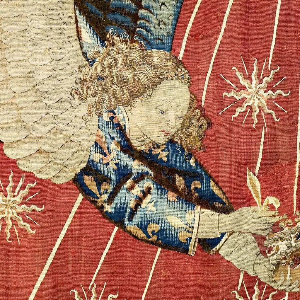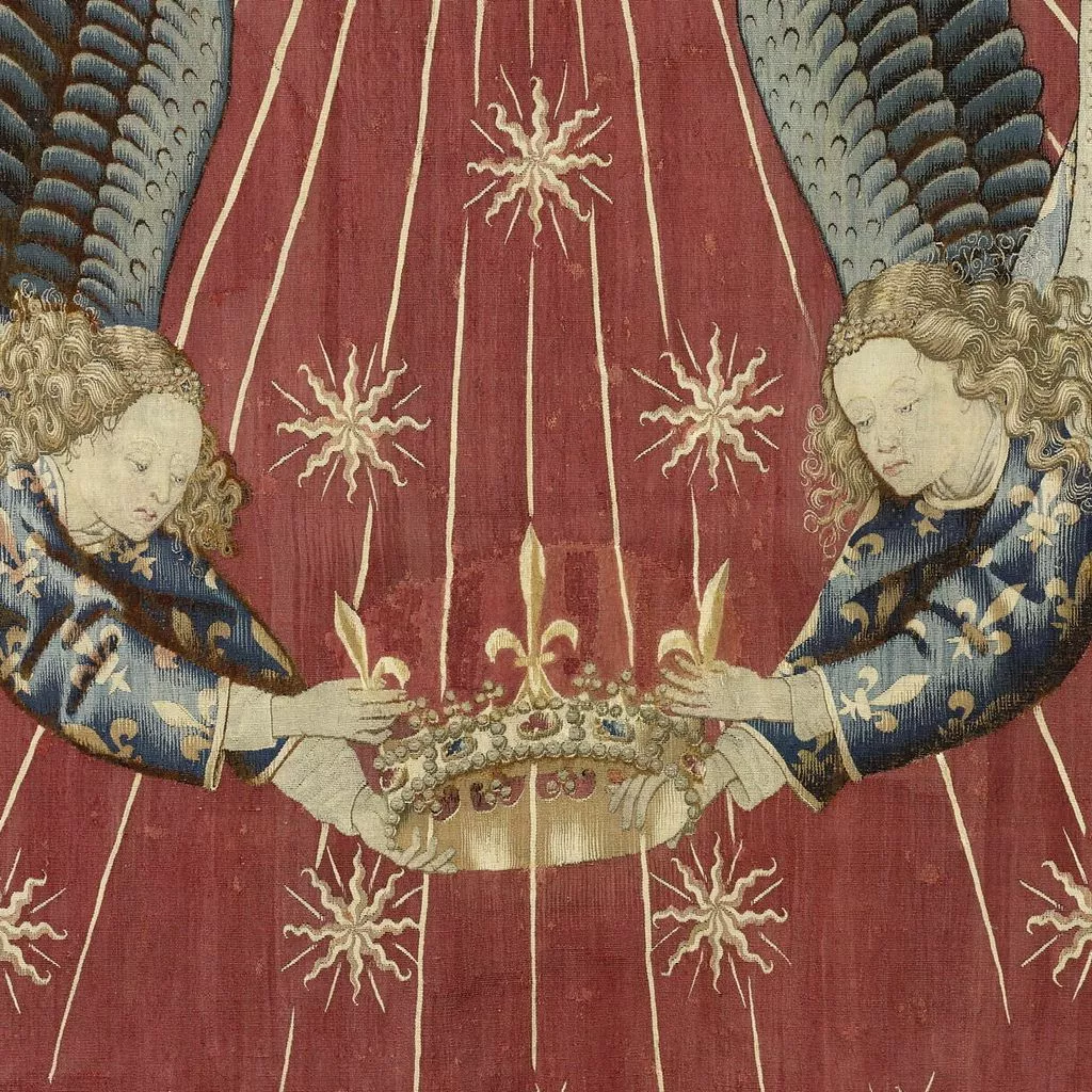 La composition du dais est extrêmement sobre : sur un fond rouge vermeil se détache un grand soleil à douze branches, dont les faisceaux de rayons sont chargés d’une multitude d’astres, tandis que deux anges en vol, vêtus de tuniques fleurdelisées, tiennent une couronne. L’analyse de l’emblématique a permis d’assurer la provenance royale de cette oeuvre : le soleil d’or sur fond vermeil fit en effet partie des devises adoptées par les rois de France au XVe siècle. Si Charles VI – roi de France de 1380 à 1422 – fut le premier à l’utiliser, le style de la tapisserie, en particulier les plis cassés des aubes des anges, ne correspond pas à l’époque de son règne. Ce dais ou plus précisément ce dosseret, c’est-à-dire la partie verticale du dais, surmontait un trône de Charles VII (texte Elisabeth Antoine).