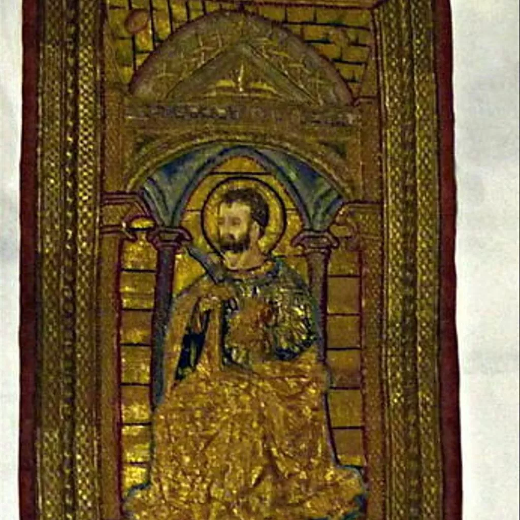Orfroi brodé provenant d'un ensemble de trois éléments d'ornement de chape : La Vierge, Saint Barthélémy, Saint Jacques le Majeur