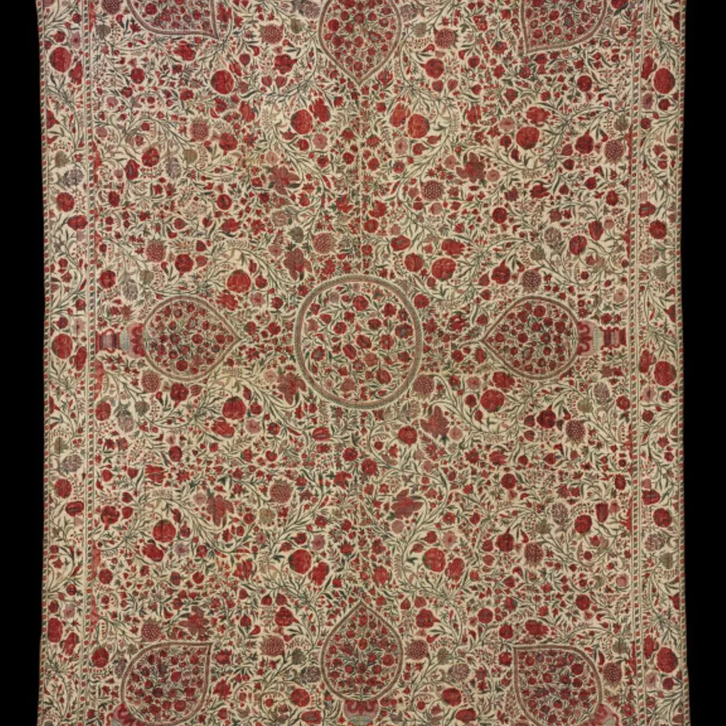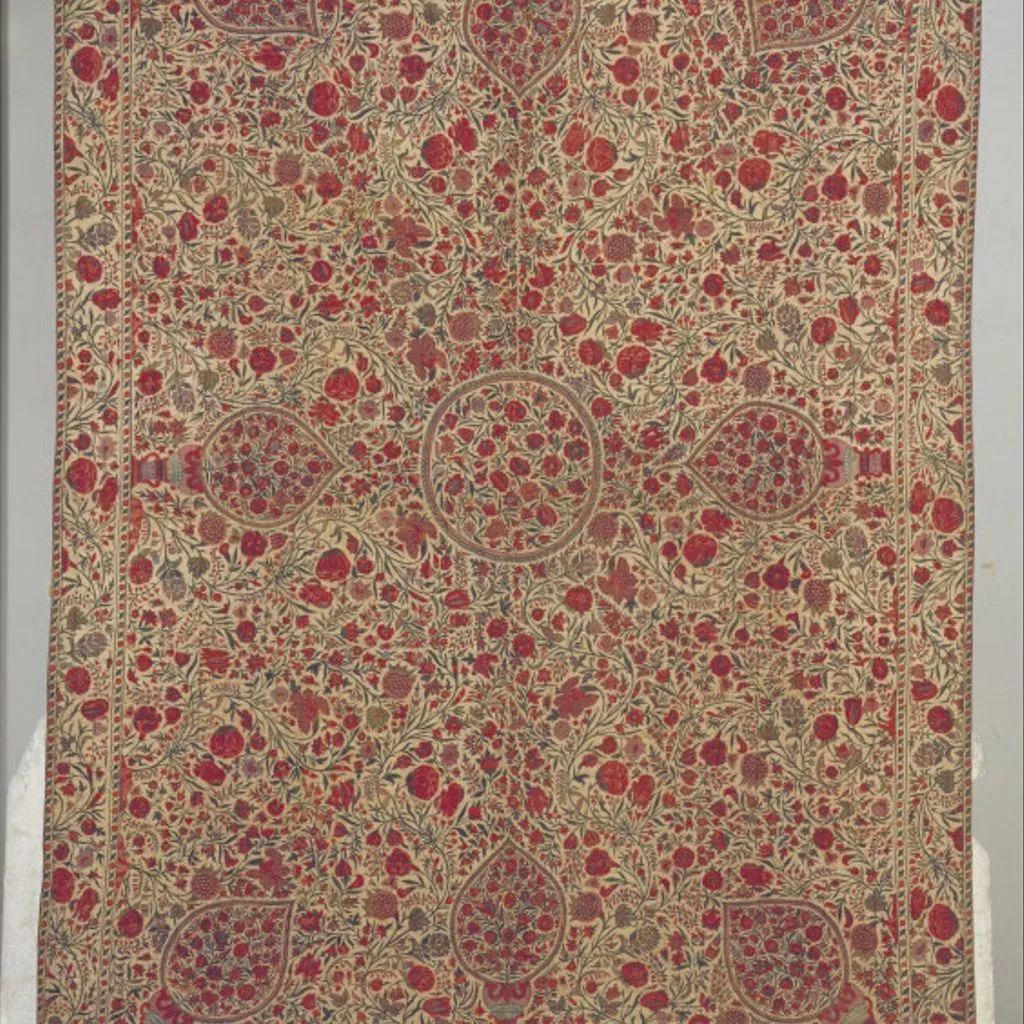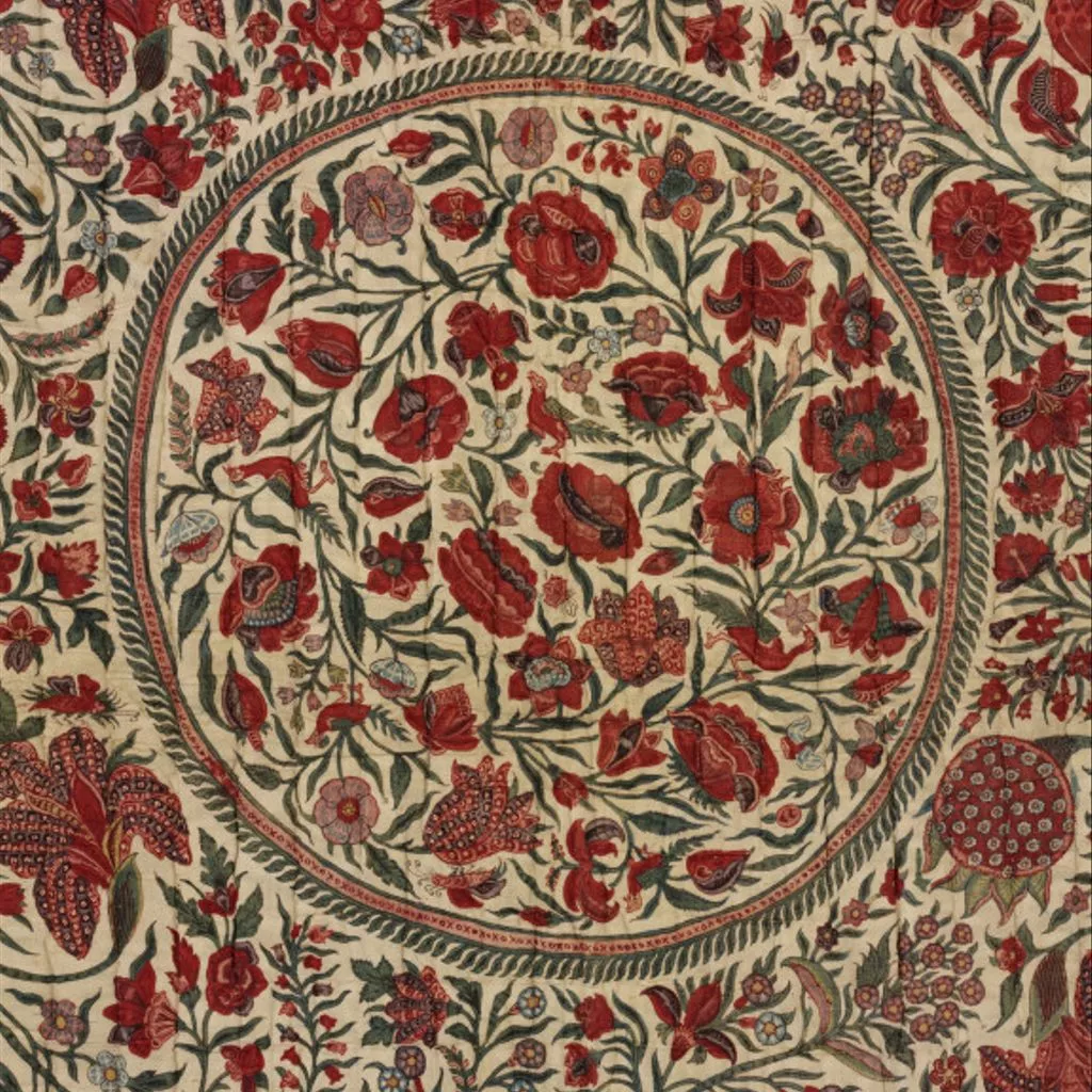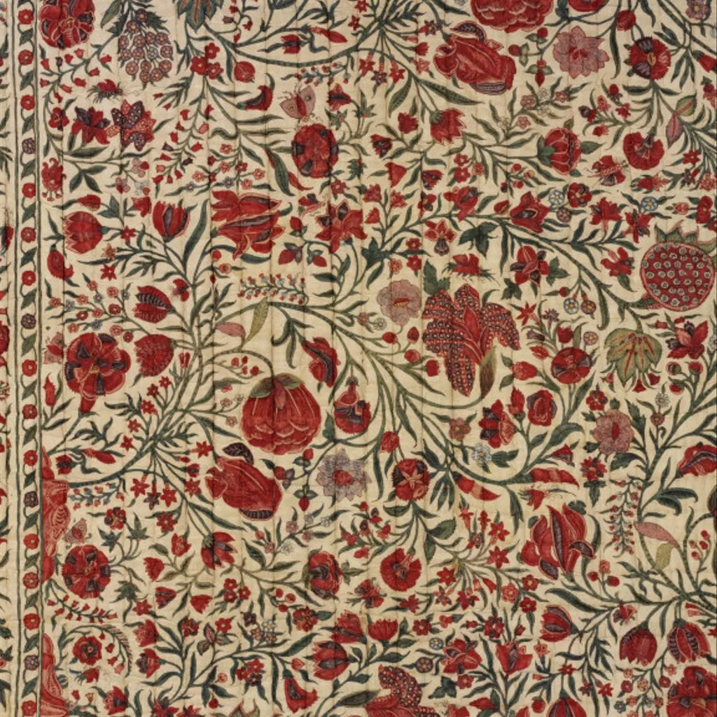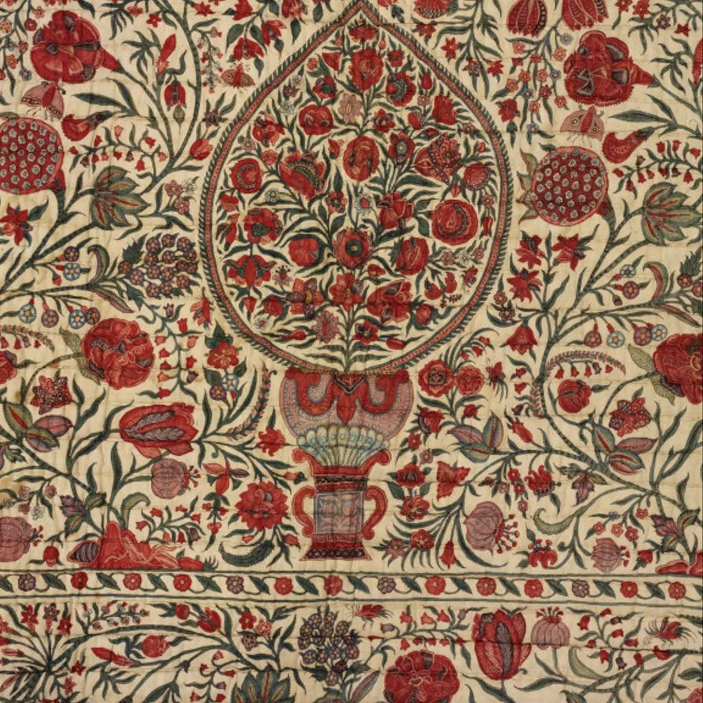 This richly patterned quilt is decorated with a mixture of real and imaginary flowers, with carnations, irises, tulips and lotus pods recognisable by their shape if not their colouring. Small birds inhabit the central medallion, while butterflies are incorporated into the crowded field design. The flowering trees that make up the main design spring from vestigial mounds at the edges of the field. Quilted chintz palampore with floral design, probably made on the Coromandel Coast, South-east India, ca. 1700-1725 A rectangular chintz palampore with all-over floral design. Central circular medallion filled with flowers. 8 tear-drop-shaped elements point inwards from the sides and corners of the field. Floral meander border. Red silk lining.