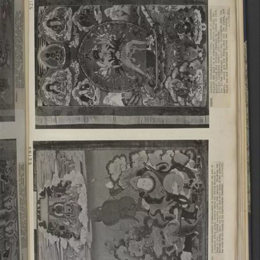 Tangka -Lamaist temple banner showing in the Upper portion, the 'Second Heaven' in which Dhyani Buddha Akshobhya appears, enthroned, surrounded by celestial worshippers and attendants; the lower portion represents the 'First (Lowest) Heaven' shows three of the four great Lokapalas or 'Guardian Kings of the Quarters', viz. Vaisravana (North); Virudhaka (South) and Dhritarashtra (East). Each heaven is shown as a separate cloud-group floating in space. Thangka showing First and second heavens; Religion, 17th-18th Century, Tibet