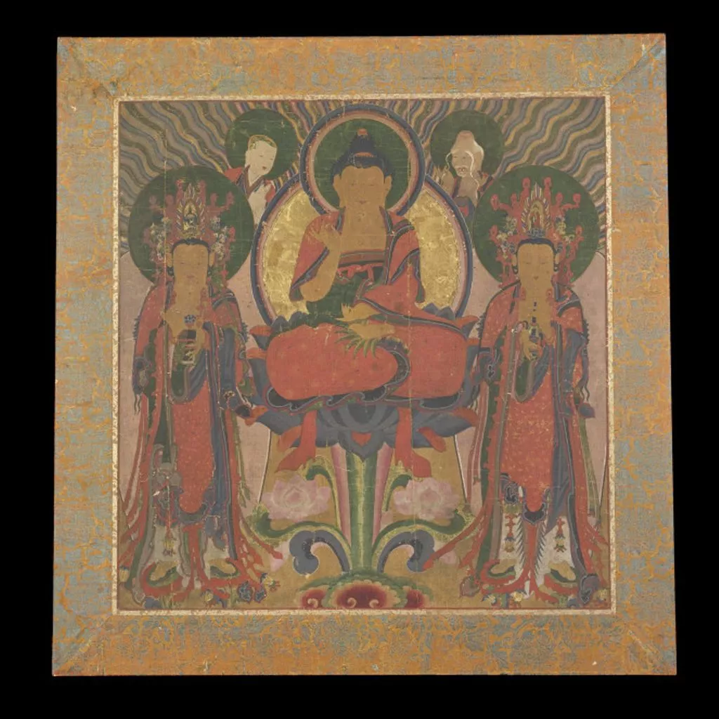 Unique The painting was probably originally a hanging scroll which was at some point cut down and framed. It is mounted on Chinese brocade dating to the early 17th century. The painting depicts the Amitabha Buddha seated in the lotus position on a lotus pedestal, his hands forming the virtaka mudra - on both hands the thumb touches the index finger to form a circle. He is surrounded by a halo and a golden nimbus. To his right in the foreground stands the bodhissatva Mahasthamaprapta holding a blue lotus and to his left, Avalokiteśvara carries a flask. In the background stand two of the disciples of Sakyamuni: Kasyapa and Ananda. Pap, Korea, paintings and drawings The painting depicts Amitabha Buddha as the central figure flanked by Buddha’s two early disciples (Ananda and Mahakasyapa), and Buddha's attendants (Avalokitesvara and Mahasthamaprapta) with auspicious spirits radiating in five colours in the background. Amitabha sits in a crossed-legged position on the blue lotus pedestal which blossomed from the ground, holds the Vitarka mudra (hand position), and the nimbus around his head and body are highlighted in gold colour. The standing Avalokitesvara carries a kundika and has the nirmana-buddha featured in his crown. The standing Mahasthamaprapta holds a blue lotus and a flask is expressed in his crown. The main colour takes on dark green and reddish hue, partly tinged with navy and yellow tones. Amitabha paintings grew longer in width and featured an increasing number of characters in the late 19th century. It is assumed that this Amitabha painting is from the early 19th century, given the relatively small number of figures, Amitabha’s high ushnisha, and the Bodhisattvas’ calm face and old-style flower crown. []