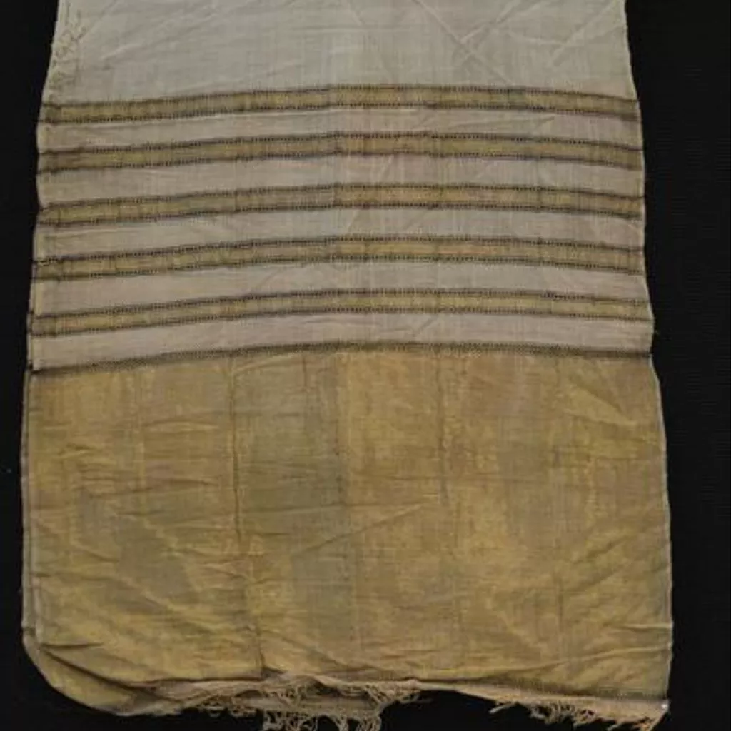 Intended for use as garment, headwear. Textile, white cotton turban piece with gold ends, Udaipur, ca. 1855. Complete turban cloth, white cotton, both ends with horizontal bands of gold-wrapped thread and black silk; fringed at both ends.
