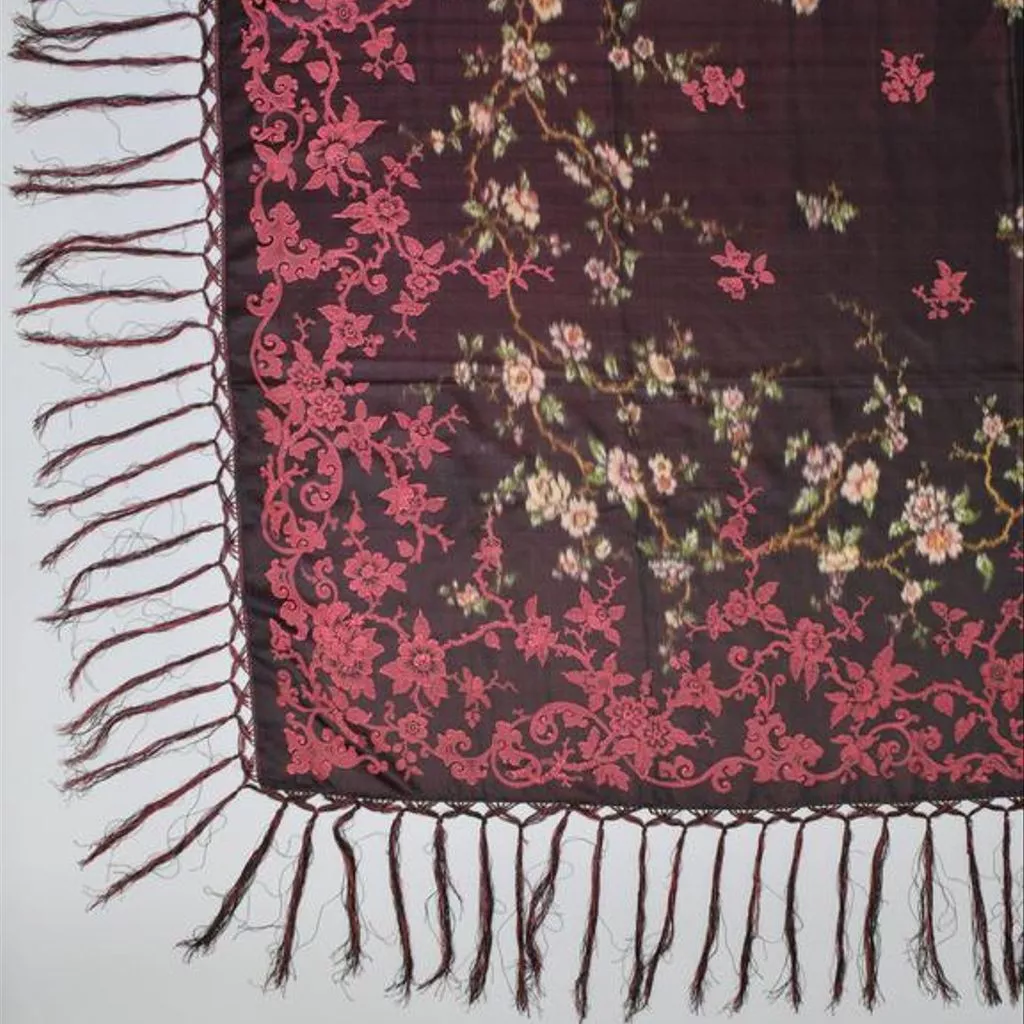 Square shawl of figured silk chiné. Woven in red and black silk with a bold pattern of flower-bearing twigs entwined with scrolls and arabesques forming a red border on the black satin ground. Within this is a second border of chiné, a continuous twiggy stem printed in yellow with green and white leaves and flowers of red, yellow, purple and bronze shades all muted with white. The centre of the shawl has scattered sprigs of flowers, some in chiné and some formed by the red silk weft. Knotted into each side is an eight inch silk fringe in black and red. Warp satin of 5. Weft pattern of loose floats, fancy twills and basket weave over warp threads in groups of three. Square shawl of figured silk chiné, possibly made in Macclesfield, ca. 1865
