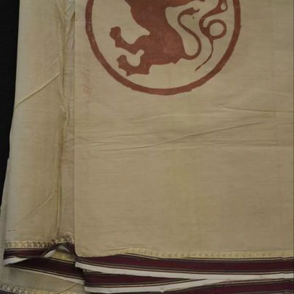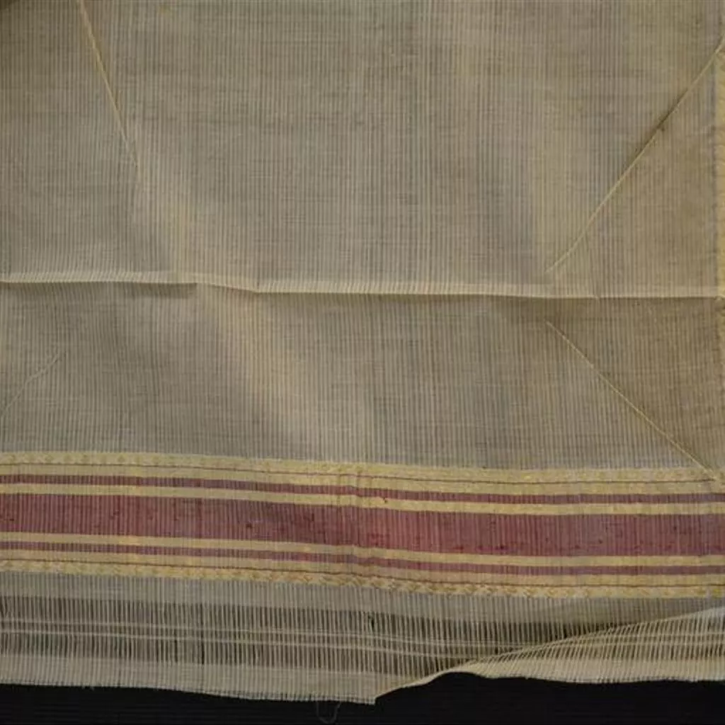 Intended for use as a man's garment. Complete wrapped garment for a man; light brown cotton with woven narrow stripes; side borders of red and green silk and gold-wrapped thread; two end borders of red silk and gold-wrapped thread in horizontal bands. A circular red stamp in the field featuring a lion and snake. Textile, man's wrapped garment, white cotton with gold borders, Chanderi, ca. 1867.