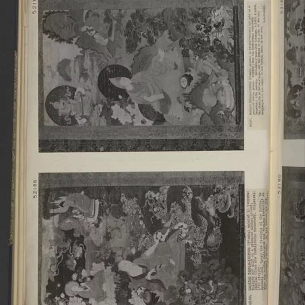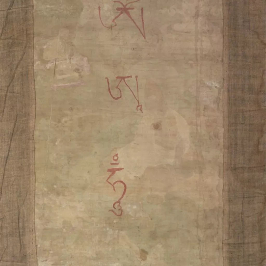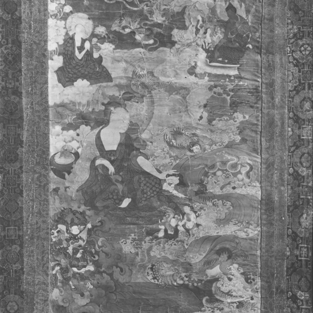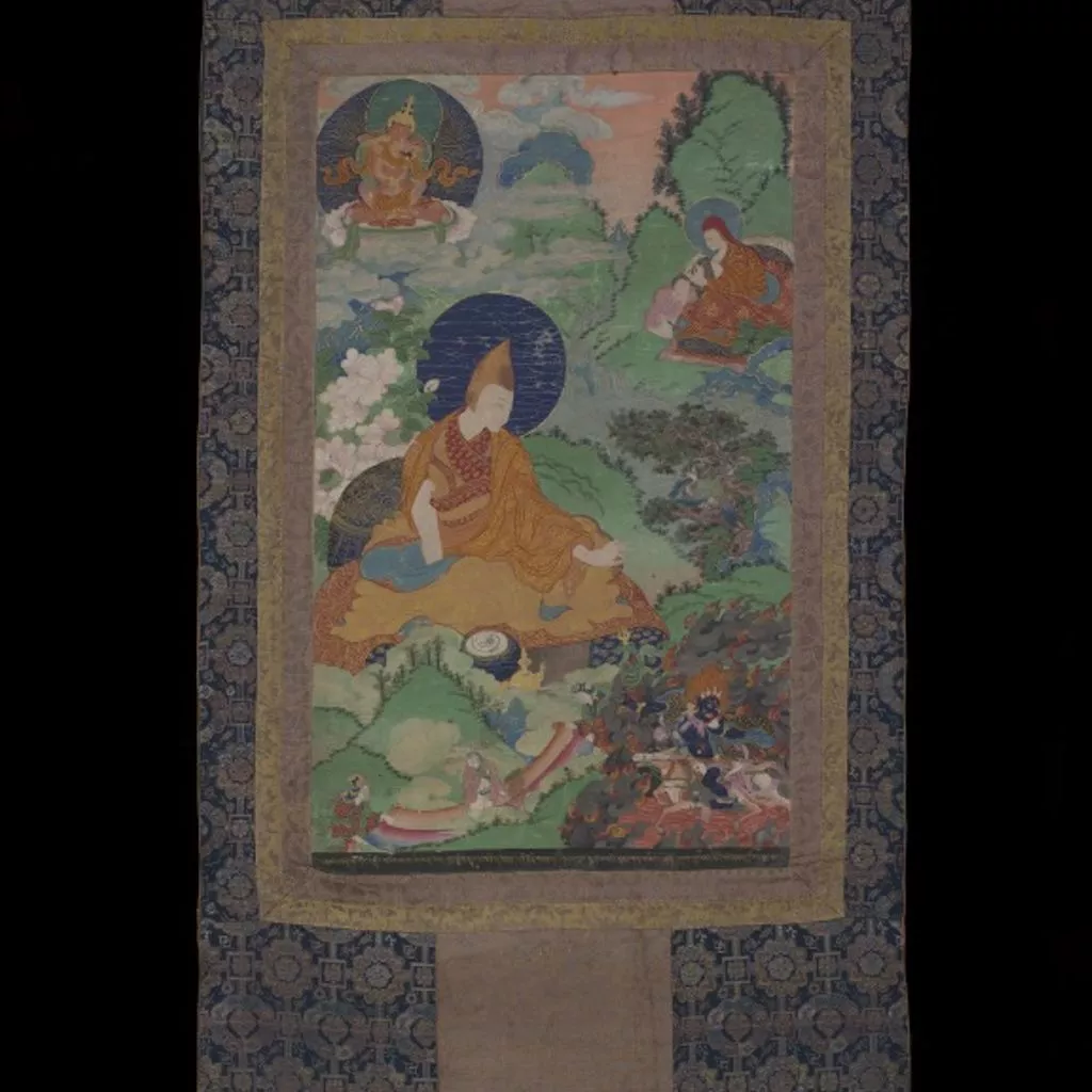 A Lamaist temple banner, tangka, In the centre is Bsod.nams.p'yogs.glan (b.1439: d.1505), He is clothed in the style of Gelugpa ("Vicorious") yellow-cap sect of Lamaism, a deified Lama attended by celescials and tantric friends. Tangka showing Bsod.nams.p'yogs.glain; Religion, Shigatse Tibet, C18